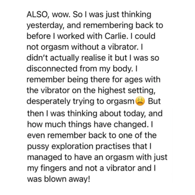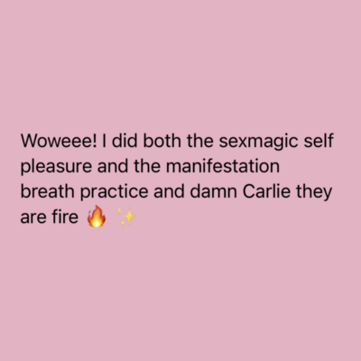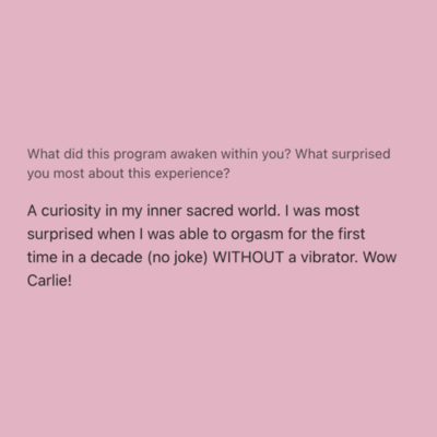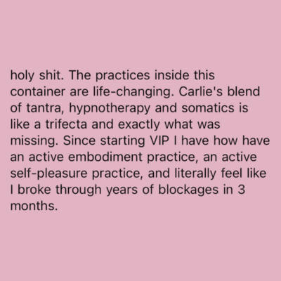 "Carlie's blend of tantra, hypnotherapy and somatics is like a trifecta and exactly what was missing. There are other people doing similar work out there, but NO ONE is doing it like Carlie! Since starting VIP I have how have an active embodiment practice, an active self-pleasure practice, and literally feel like I broke through years of blockages in 3 months".