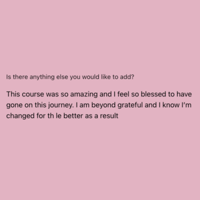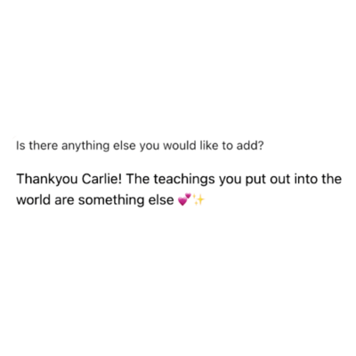 Carlie is truly a gift to this earth, she has the most beautiful aura and her energy is so uplifting and vibrant. There is no way that you can’t help but just love her! There are not enough words to describe the transformation I have experienced during this VIP course, the content throughout was sooo juicy! Honestly, the biggest thing Carlie has gifted me was help in finding my voice and identity again. I found love and confidence in myself which had been lost for many years. I am following what lights me up and through connection to my intuition I have found purpose and direction in my life/career. I have become a stronger and happier mother to my children and am learning to go with where my energy wants to flow.