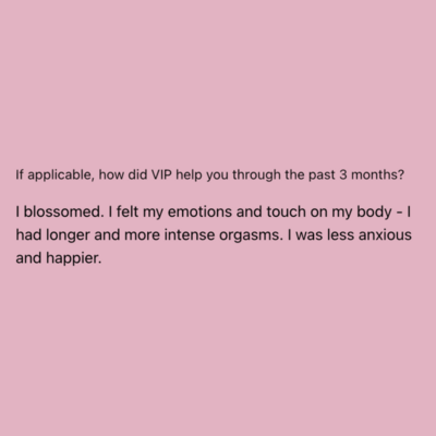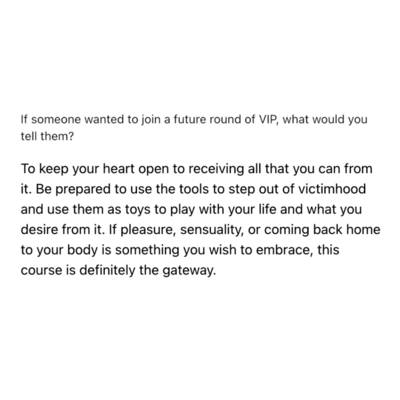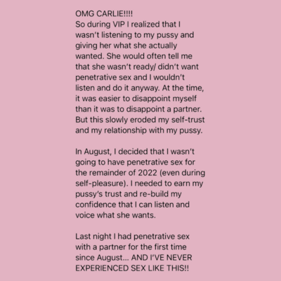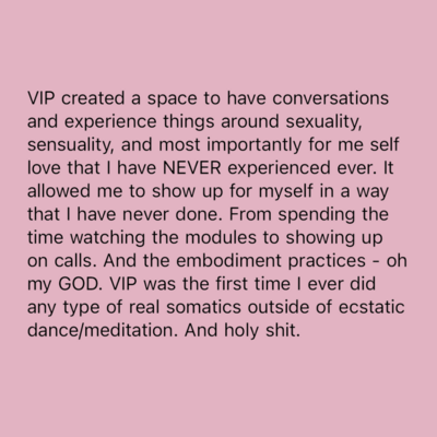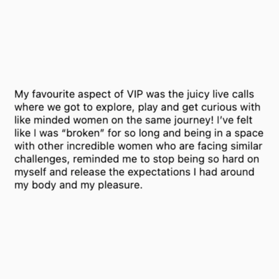 VIP is the most incredible and loving gift you can give your yoni, your womb, your heart, your partner and your lineage. Carlie teaches you all of the things we SHOULD HAVE been taught in school. I was so disconnected from my body because I didn’t truly know her, I had never given myself the time to get curious, learn and explore. I am so grateful for all the teachings of VIP! VIP is life changing and life giving. Thank you Carlie for creating this essential and sensual experience 💗 I’m beyond grateful to have received this gift! My favourite aspect of VIP was the juicy live calls where we got to explore, play and get curious with like minded women on the same journey! I’ve felt like I was “broken” for so long and being in a space with other incredible women who are facing similar challenges, reminded me to stop being so hard on myself and release the expectations I had around my body and my pleasure.