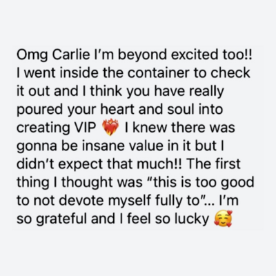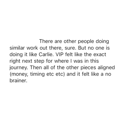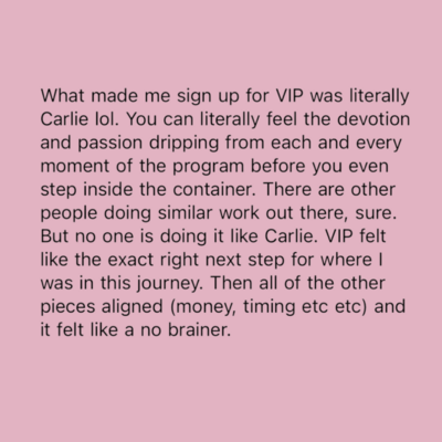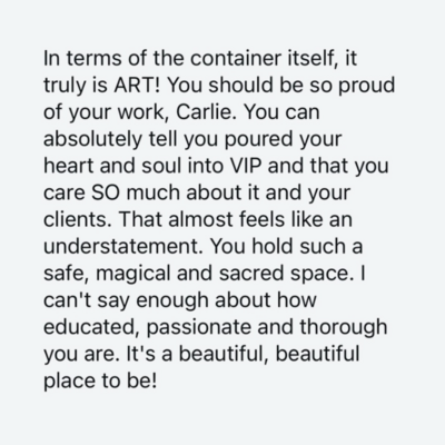 VIP and even Carlie's presence in general mirrored so much back to me. What initially drew me to her was how she embodied her work. Some mentors I feel sometimes write or preach more than they have actually let settle in to their bodies yet, with Carlie I felt her presence encapsulated MORE than words could describe. My ability to slow down on calls, take my time, listen with my heart more than my mind, I feel were all mirrored from her. So many elements of this course were new concepts but I felt I could integrate them so easily. She makes the work feel like play. Also I loved the structure of VIP. Each module was so relevant, so fluid, and the application of her hypnosis recordings and guides to do on your own made the whole thing feel so immersive.