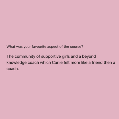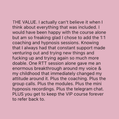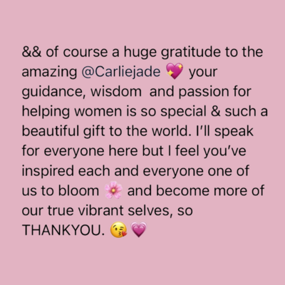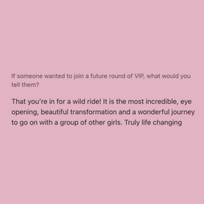 VIP is by far one of the best investments I have ever made in myself. The last 9 weeks have been absolutely amazing and magical. Carlie is such a beautiful person and has the ability to see you and encourage you to embrace the best version of you. Over the last 9 weeks, I have felt amazing shifts in my life and learnt so much about myself. I gained the confident to find a new job that lights me up, embraced my most pleasure filled self and started to discover a new love for myself. And so much more! I started this course unsure about myself and who I was & didn’t know what to expect. I can honestly say every week surprised me, after every call I felt empowered, filled with excitement. arlie has created a beautiful and safe space for women to connect and support each other as we heal, find our purpose and embrace our inner goddess. VIP has been one of the most amazing experiences and I couldn’t recommend it enough.